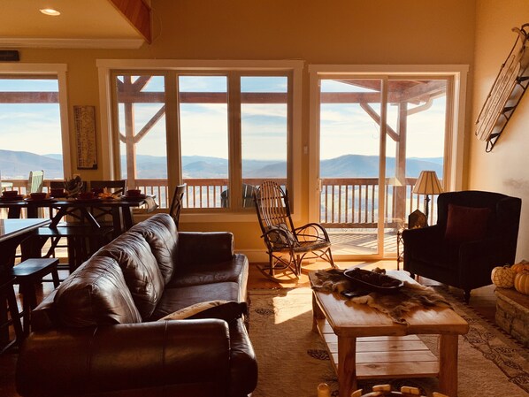 The Treetop Terrace has three levels of cozy beauty, with a bedroom and full bath on each floor. The first floor offers a fireplace in the bedroom with queen size bed bunk beds with a twin trundle and a day bed with twin trundle sleeping 7 total. In the first floor bedroom you will enjoy direct access to the wraparound deck. The second level hosts another wraparound deck with breathtaking views, the main room, fully functioning and stocked kitchen, and a spacious king size bedroom. The upper floor offers a loft and private suite with a third bedroom and a king size bed. The loft is perfect for hanging out to read late into the night or greet the day with a quiet cup of coffee. The loft has a queen sleeper sofa for extra guests. If you are a morning person, you will never see a prettier sunrise than from the loft at The Treetop Terrace. Enjoy luxurious surroundings and the panoramic view from every room in the house.
