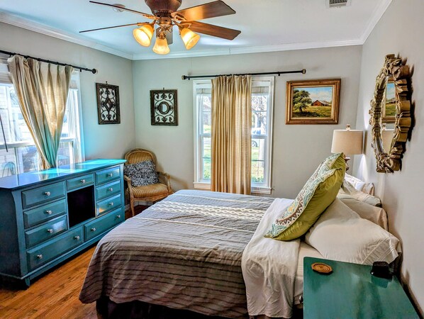 Deze lichte open ruimte heeft 3 ruime, goed ingerichte slaapkamers, met 3 comfortabele queen size bedden, allemaal bedekt met gel infused memory foam matras toppers voor een goede nachtrust. Twee van de slaapkamers zijn volledig privé, met de derde semi-privé (zie foto's). De onlangs vernieuwde badkamer in de hal heeft alles wat je nodig hebt en meer, inclusief een kleine selectie toiletartikelen, net als het geval is.