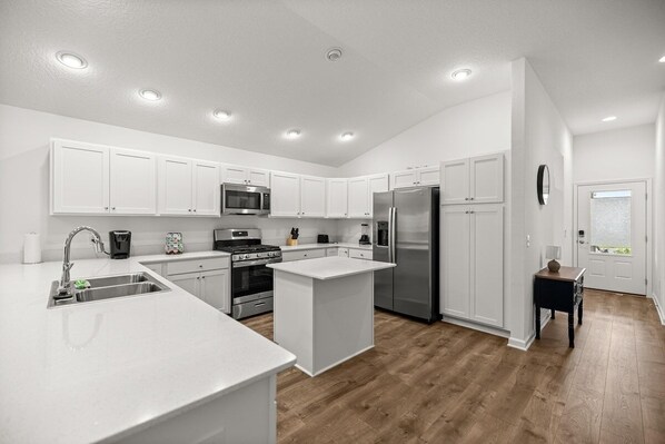 The fully stocked kitchen is thoughtfully equipped with everything you need for convenience and easy meal preparation, including: