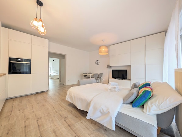 Jesionowa Spacious Apartment is a stylishly furnished apartment featuring a living room with a sofa bed and a kitchenette, a bedroom with a sofa bed and a desk suitable for studying or remote work, a second bedroom with a double bed, a walk-in wardrobe, a bathroom, and a spacious terrace where Guests can relax and enjoy their morning coffee or an evening glass of wine. Guests have access to a range of practical amenities, including free Wi-Fi, terrestrial TV, an iron, a washing machine, a hair dryer, a fridge with a freezer, a dishwasher, an oven, a coffee machine, a kettle, and kitchenware. A parking space is also available, without a guarantee of availability.