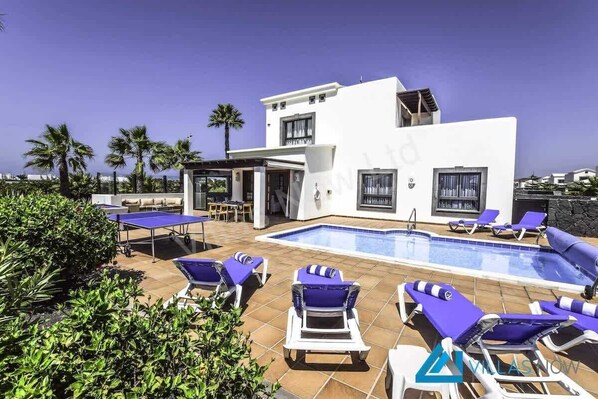 Local amenities include two supermarkets, bars, restaurants, cafes around a 10-minute walk. In less than five minutes from the villa you are strolling along Playa Blanca's unique 12-kilometre promenade which links the lighthouse to the Rubicon Marina. A short distance along the promenade you will find a variety of International restaurants as well as cocktail bars overlooking secluded beaches and coves. The main flamingo beach is around a 45-minute walk. There is a very efficient bus service that runs regularly every 30 mins, together with easy access to taxis which can take you into Playa Blanca or the Marina Rubicon within a matter of a few minutes. The taxis would cost between 4 and 5 euros to get into the centre of Playa Blanca. The airport is approximately 35 minutes' drive from the villa which offers two private parking spaces.