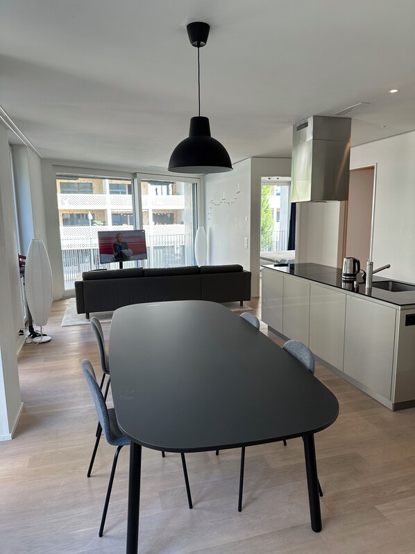 Wir konnten pünktlich in das sehr saubere Appartment. Bad und Schlafzimmer waren zu unserer Zufriedenheit. Da wir aber 4 Erwachsene waren und auch dafür gebucht hatten, gab es im Wohnzimmer nur eine sehr schmale Couch ,die nur für einen Erwachsenen möglich ist. So musste die 2. Person auf dem Sofa schlafen, was nicht sehr komfortabel für 3 Nächte ist. Die Küche wäre sehr schön aber... Die Beleuchtung war defekt und somit dunkel... Es gab nur sehr wenig Geschirr für 4 Personen, so dass wir nach jeder Mahlzeit die Geschirrspülmaschine laufen lassen mussten (nicht sehr umweltfreundlich da nur wenig gefüllt)... Einige Küchenutensilien fehlten gänzlich: gute Töpfe , Weingläser, Teekanne, Salatschüssel, Wasserkrug, Schäler, Zitronenpresse... Und der Wasserkoch war leider auch defekt... Und es gab nur ein Geschirrhandtuch... Fazit: mit nur wenig Investition könnte die Küche top sein...und ein richtiges Schlafsofa ist auch notwendig, wenn für 4 Personen vermietet wird. Wir haben ein Appartment gewählt, da wir gerne selber kochen aber in einer solchen Küche macht es keinen Spaß. Haben unsere Anmerkungen dem Vermieter geschrieben aber leider keine Antwort erhalten.