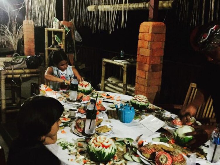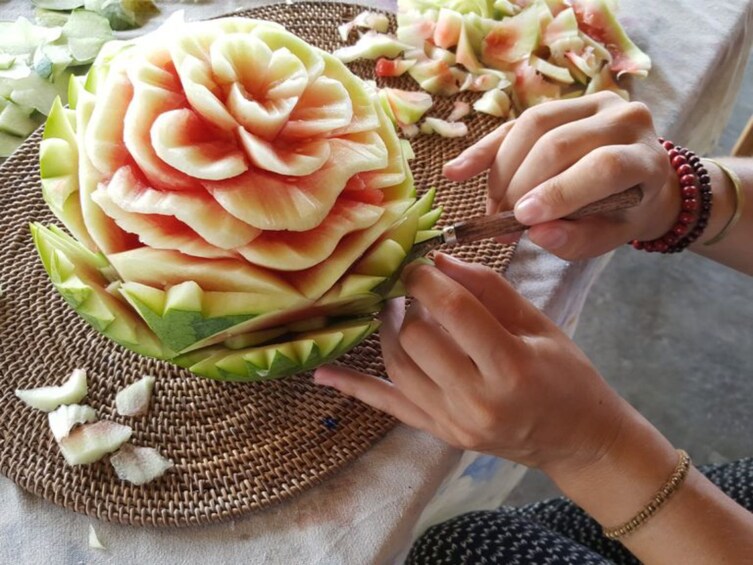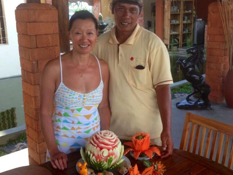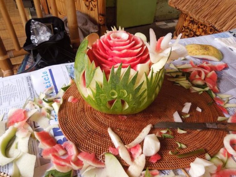 Ervaar de bijzondere Balinese Fruit Carving Class. Fruit snijden is een gelukkige manier om van je tijd op Bali te genieten. Maak van eten kunst en presenteer je eigen kunstwerk tijdens het eten voor vrienden of familie. Net zo enthousiast als houtsnijwerk en steenhouwen, vereist ook fruitsnijwerk geduld en precisie om een prachtig meesterwerk te maken. In de Bali Fruit Carving Class gebruik je echter fruit of groente als kunstvorm. De instructeur laat de techniek zien om de vruchten te snijden. Leer hoe je een bloem, dieren of je naam op een watermeloen, papaja en andere dingen kunt kerven. Alle vruchten en gereedschappen zijn aanwezig. Het pakket bevat ook een welkomstdrankje.