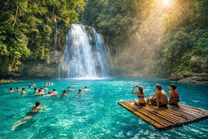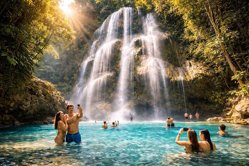 • Geniet van een verfrissende duik in de beroemde turquoise zwembaden van de Kawasan watervallen