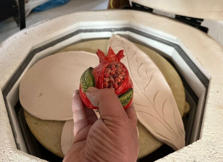 Terwijl je eigen granaatappel wordt beschilderd en gebakken - een proces dat ongeveer twee weken duurt - neem je een prachtig bewerkte granaatappel mee naar huis die door een eerdere deelnemer is gemaakt. Je handgemaakte granaatappel wordt dan doorgegeven aan de volgende bezoeker, zodat er een continue cyclus ontstaat.